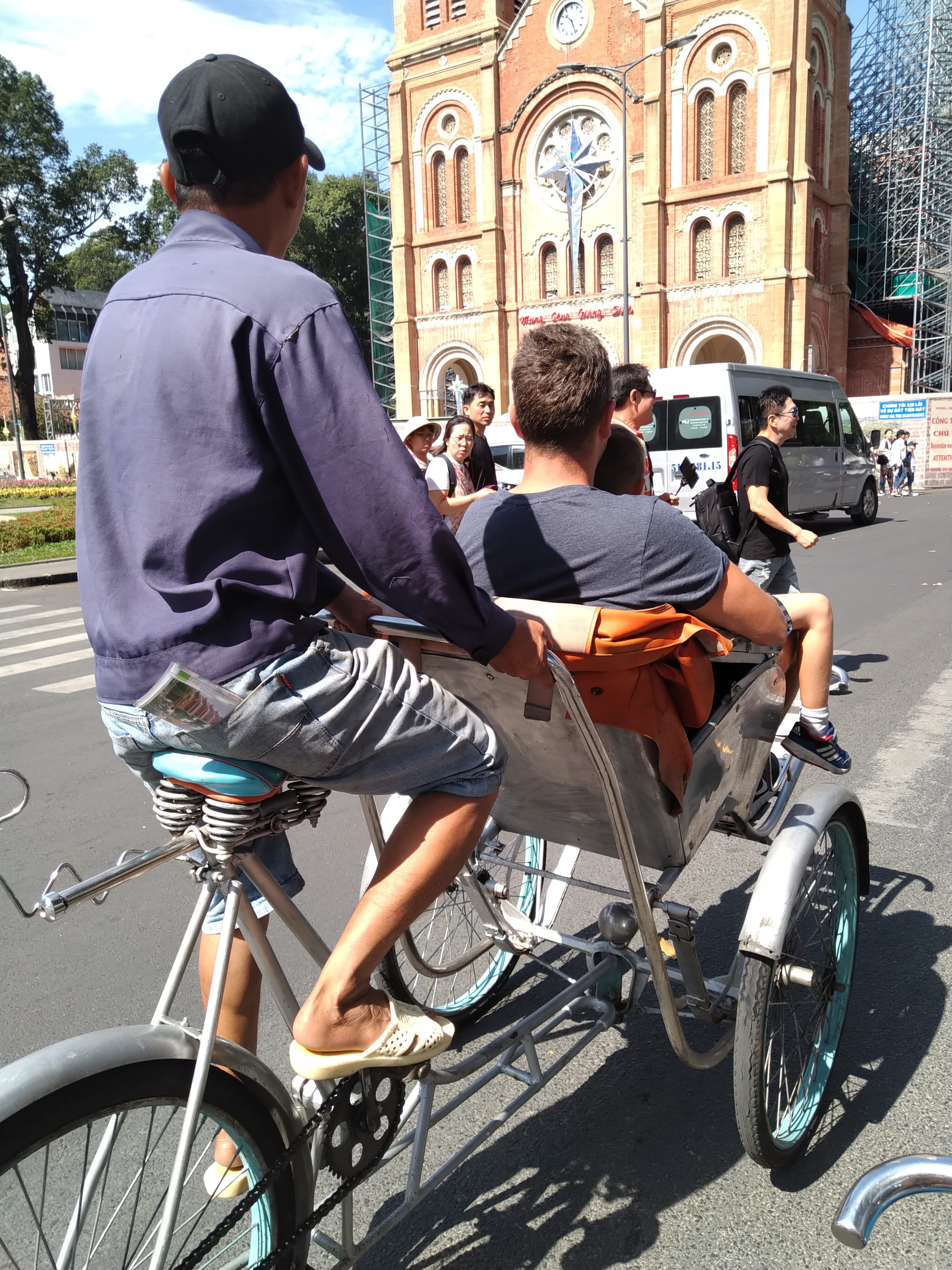 Da vi var færdige med morgenmaden ville vi ud og se lidt på byen. Drengene meldte hurtigt ud at de var trætte af oplevelser og Bisse gjorde det klart at han ikke havde tænkt sig at gå langt i dag for han var træt i benene. Vi måtte derfor tænke kreativt, for selvfølgelig har vi forståelse for at man kan være træt og ikke gider gå rundt, men samtidigt har vi kun i dag til at opleve byen. Vi bestilte derfor 2 cykeltaxier som kunne fragte os rundt og se de vigtigste ting i byen. Vi spurgte til prisen, og fik at vide at det kostede 1500 VND pr. Time pr. Taxi. Det lød billigt, så Mic spurgte 1500 er det korrekt, ja sagde chaufføren og Mic sagde igen 1 tusind 5 hundrede – ja sagde chaufføren. I betragtning af at en vietnameser tjener omkring 300 kr om måneden passer det jo meget fint.