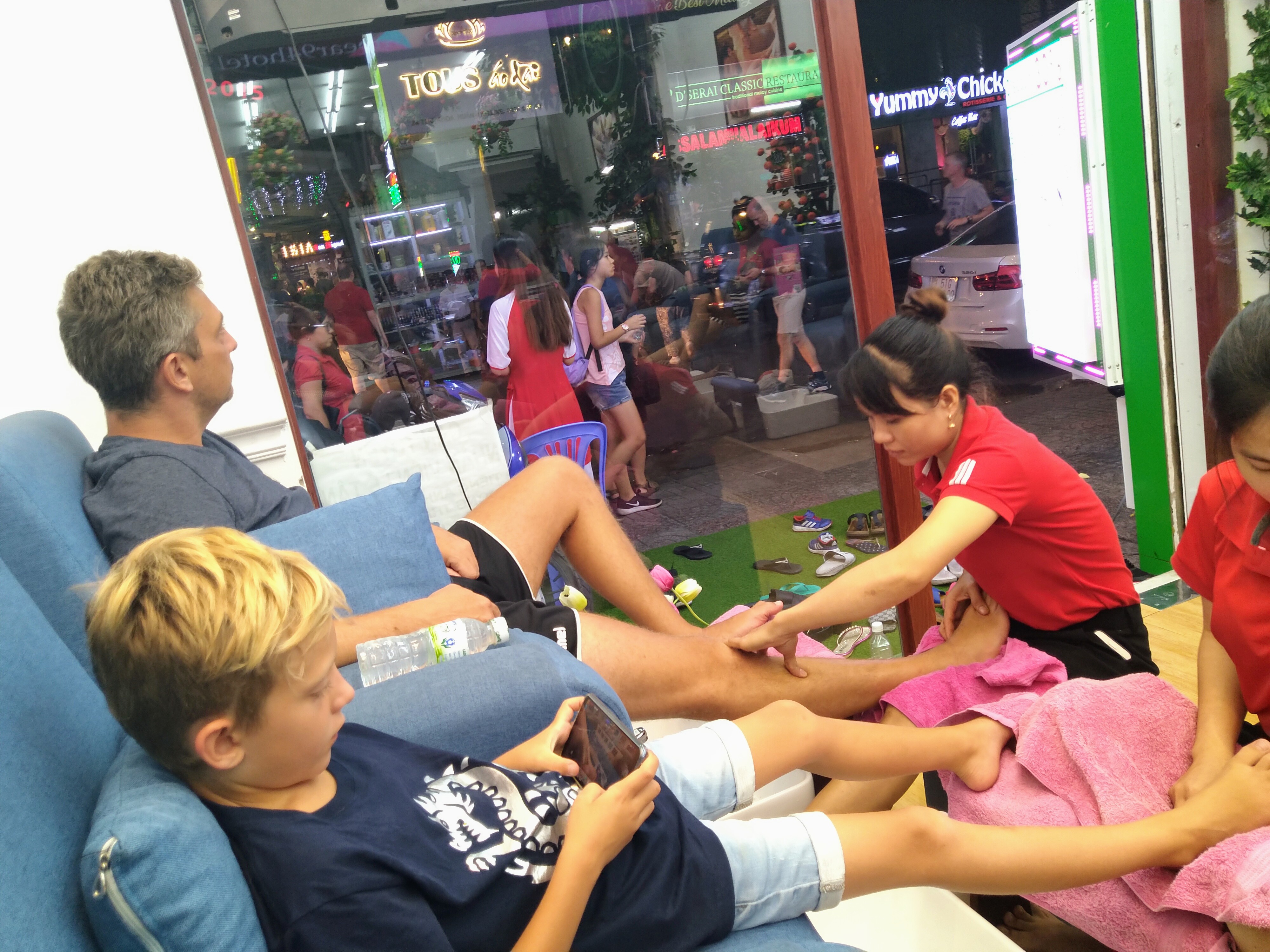 Aftensmaden blev spist på en super hyggelig cafe lige ved siden af vores hotel, den var rimelig dyr men maden var god, og ingen af os havde lyst til noget alt for fremmed i dag. Efter maden havde vi lovet drengene at vi skulle slappe af med noget fodmassage, vi gik derfor over og fandt et sted som så ok ud. Vi blev sat på en række og så gik de ellers i gang, manden jeg fik massage af pudsede så lige næse i sine hænder, og smed snotten over på gulvet, hvorefter han lige tørrede hænderne i håndklædet jeg sad på og så masserede han ellers videre. Her stoppede nydelsen ligesom for mig, jeg syntes det var så klamt og jeg kunne slet ikke holde tanken ud. Hvem gør sådan noget, det er da så klamt.