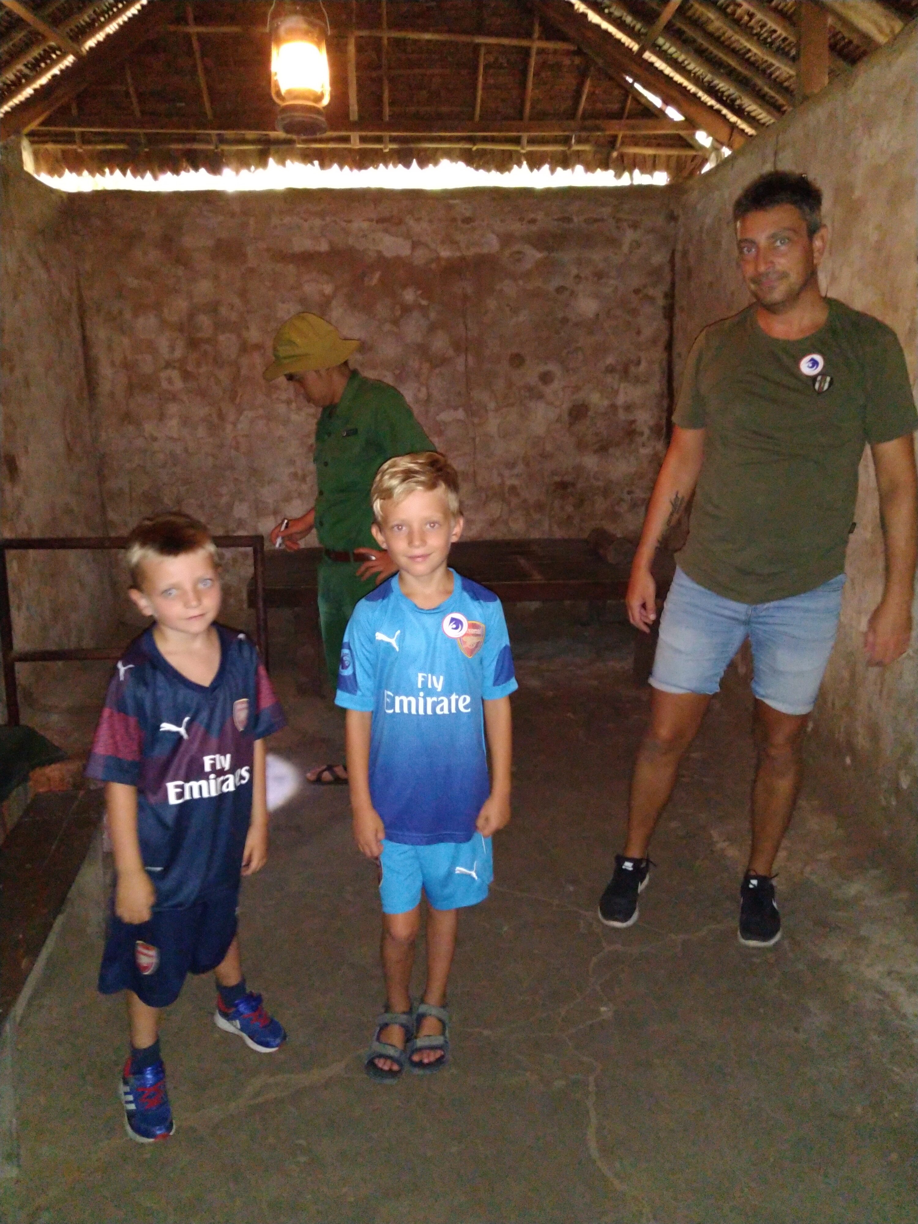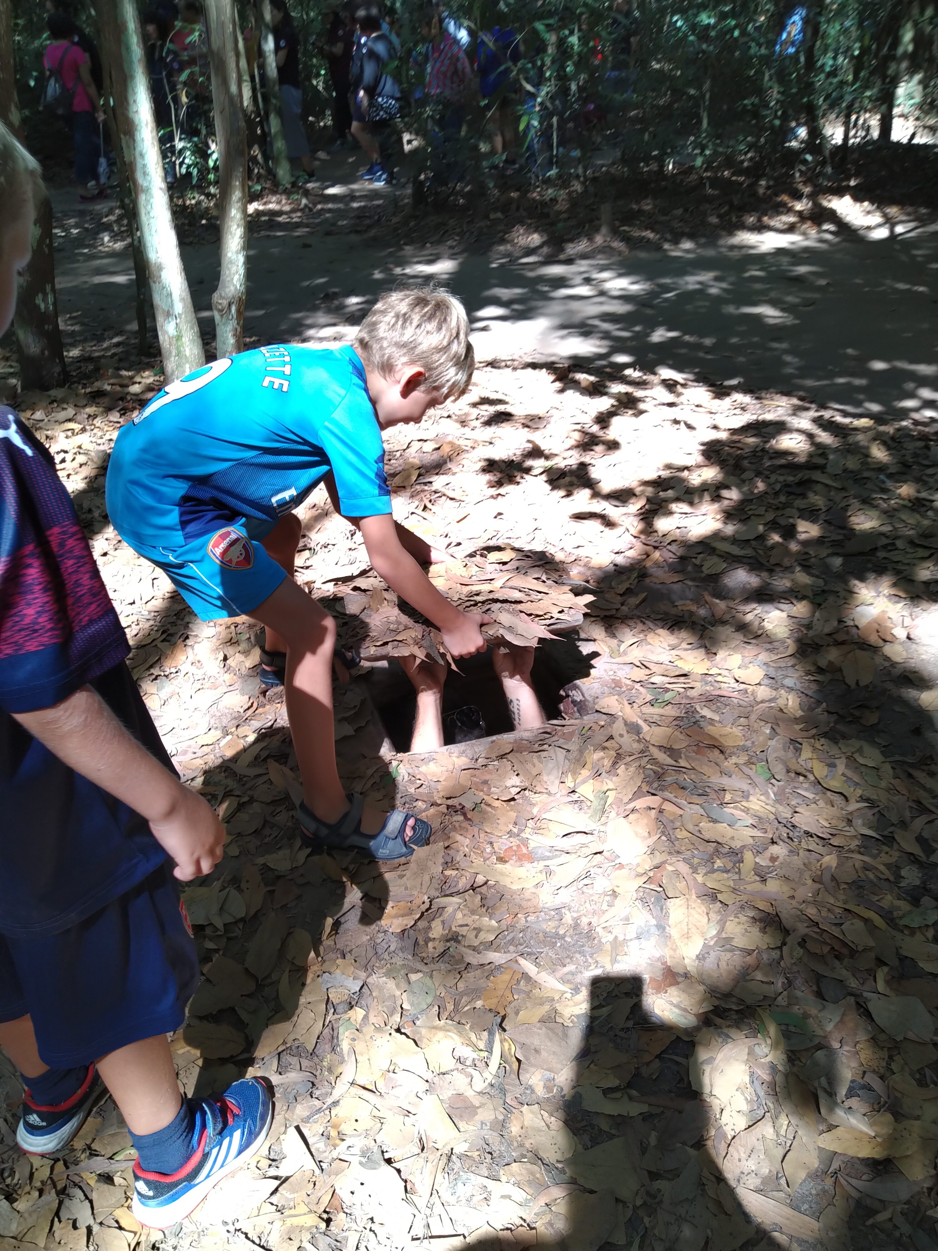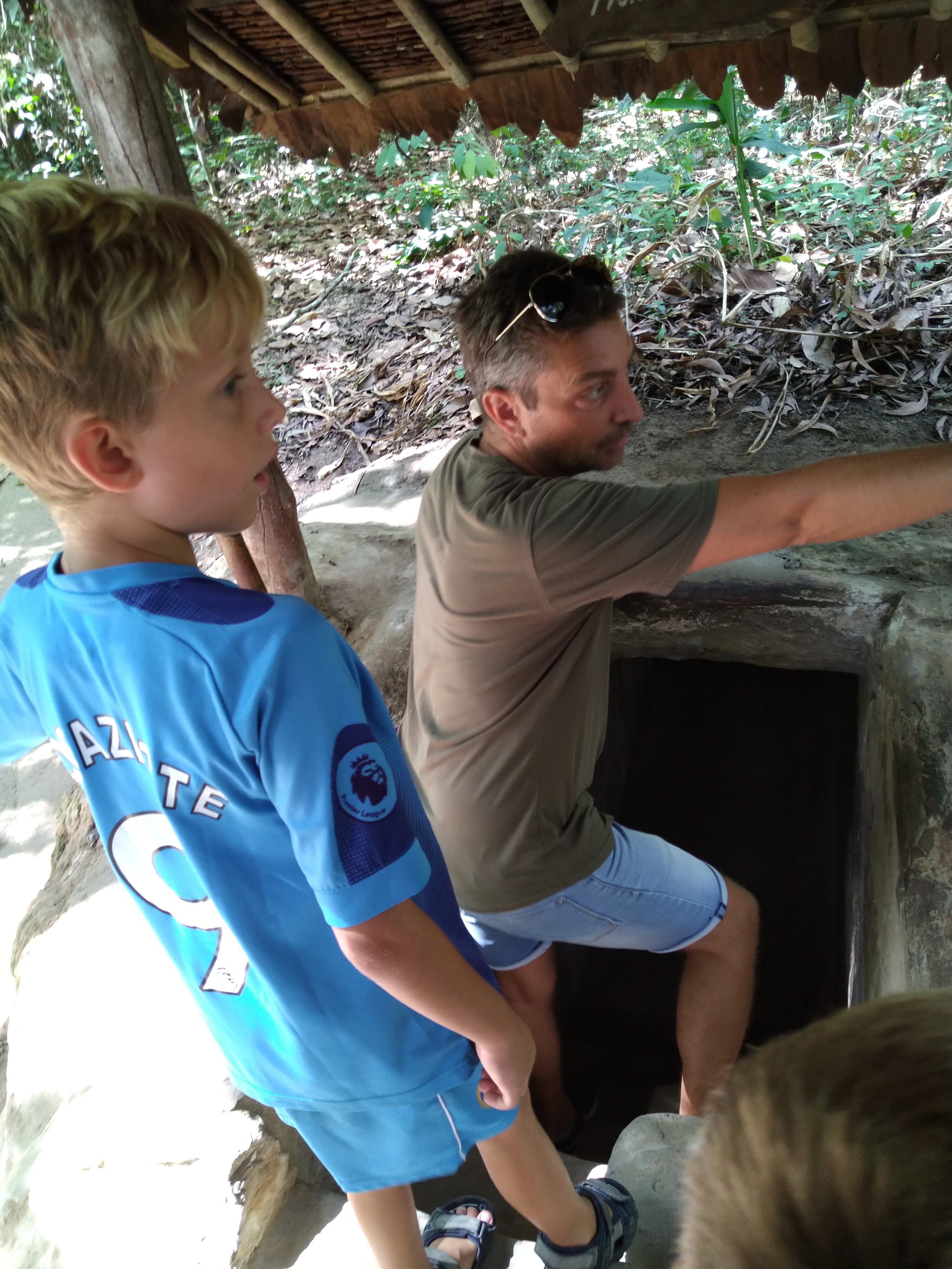 Da vi ankom til tunnelerne var der selvfølgelig mange mennesker, vi fulgte vores guide som startede med at vise os en masse fælder som vietnameserne havde lavet. Det var virkelig uhyggeligt at se, og man får hurtigt fornemmelsen af at den krig har været ekstrem voldsom. Tunnelerne var små, og selv om de faktisk havde lavet dem lidt større for at turisterne kunne komme ned i dem, så fik man hurtigt klaustrofobi når man var nede i dem. Vi gik alle 4 ned i en tunnel, men drengene og jeg gik op igen da vi fik muligheden for det, Mic gik videre og fortalte at det kun var blevet mere snævert undervejs.