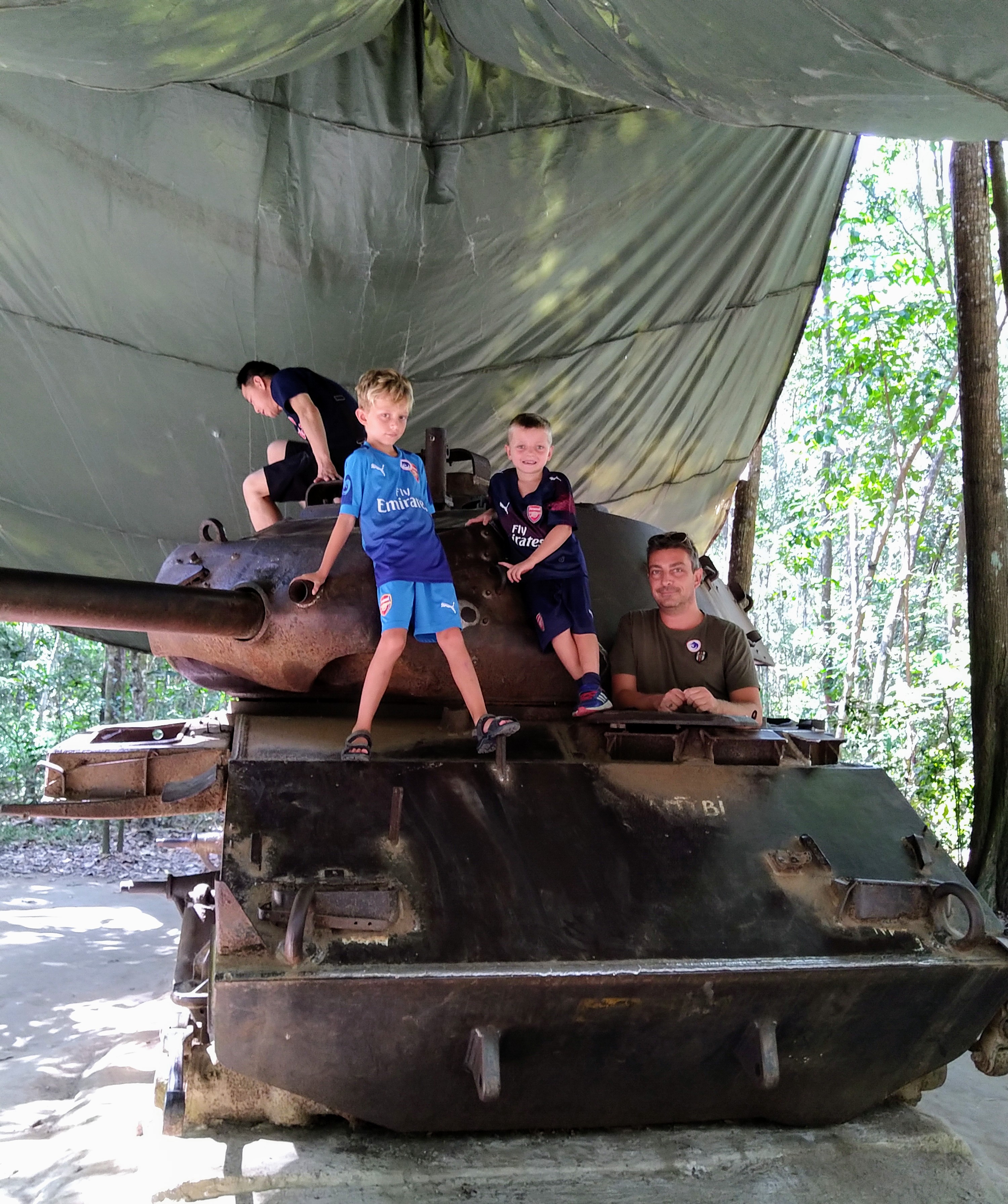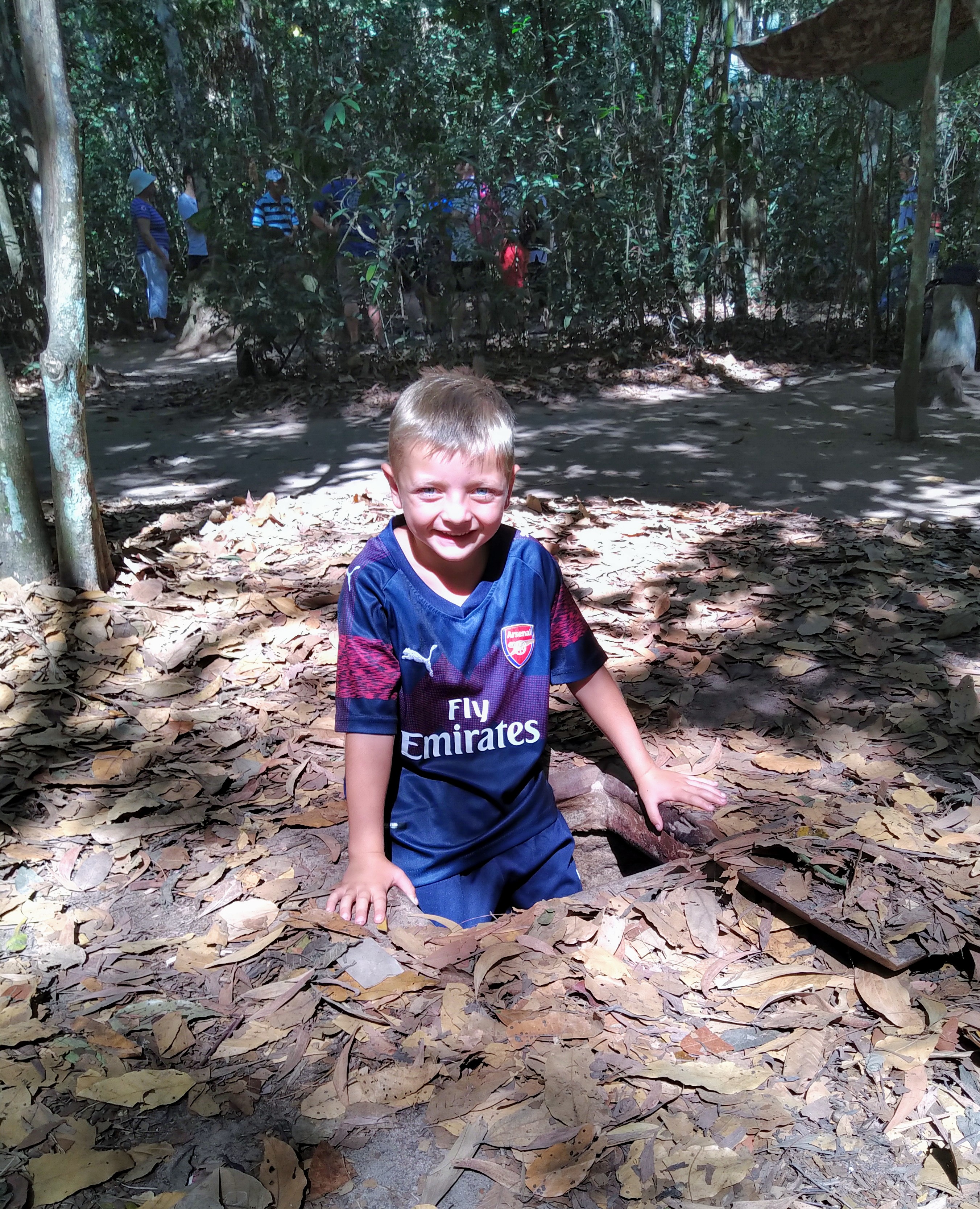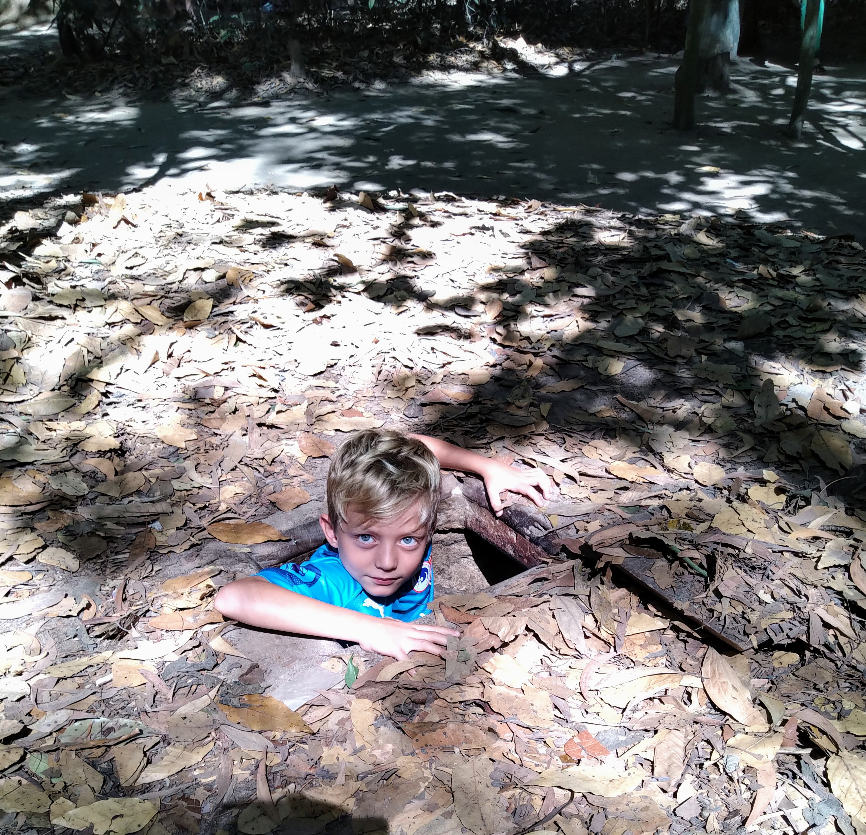 Da vi ankom til tunnelerne var der selvfølgelig mange mennesker, vi fulgte vores guide som startede med at vise os en masse fælder som vietnameserne havde lavet. Det var virkelig uhyggeligt at se, og man får hurtigt fornemmelsen af at den krig har været ekstrem voldsom. Tunnelerne var små, og selv om de faktisk havde lavet dem lidt større for at turisterne kunne komme ned i dem, så fik man hurtigt klaustrofobi når man var nede i dem. Vi gik alle 4 ned i en tunnel, men drengene og jeg gik op igen da vi fik muligheden for det, Mic gik videre og fortalte at det kun var blevet mere snævert undervejs.