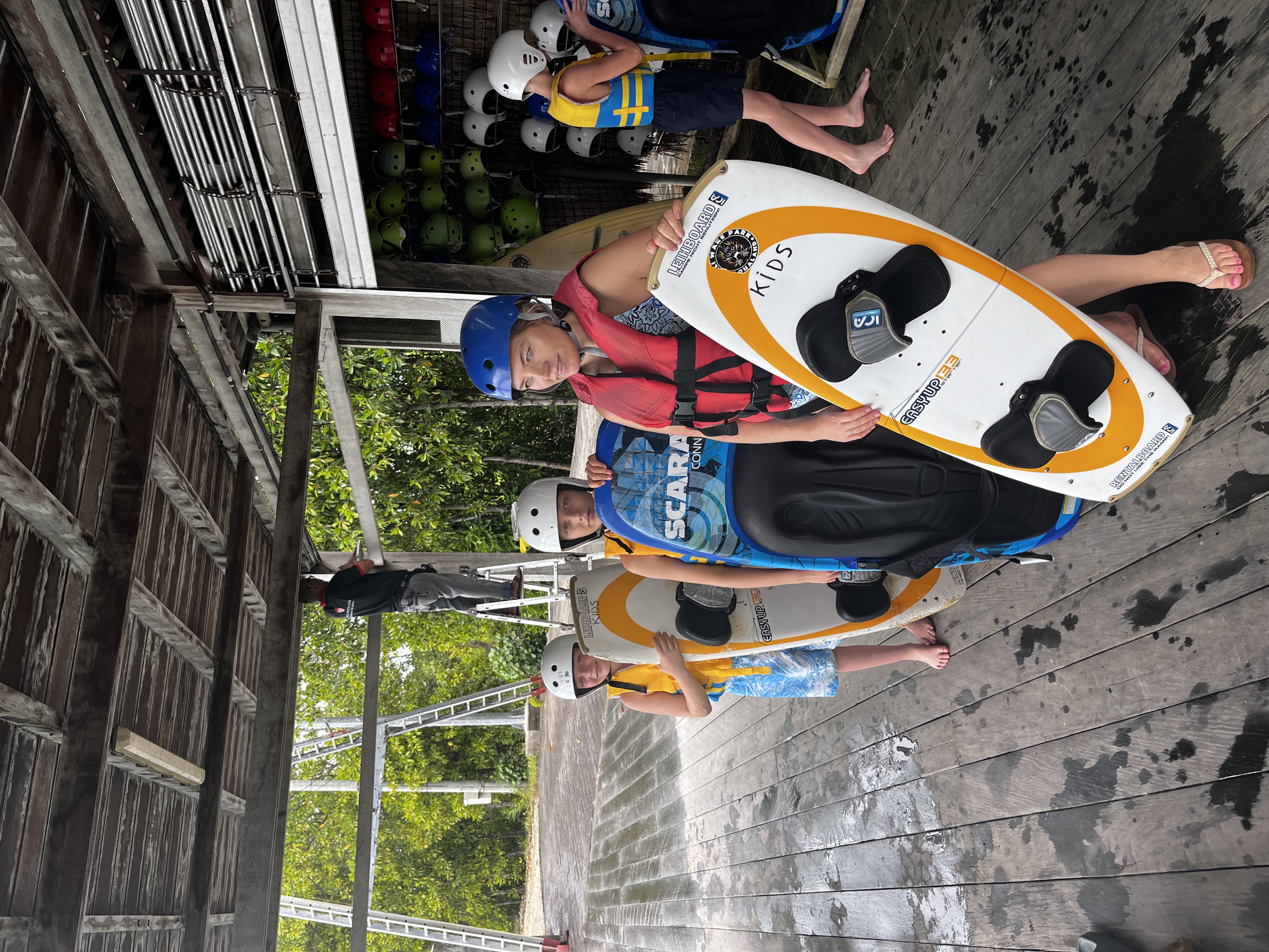 Michael, Jesper, Betina og Leah havde ikke lyst til at prøve, så de hyggede sig i caféen imens. Da vi var færdige med wakeboard skulle børnene over og lege på den vandbane der hører til parken. Det var tydeligt at mærke på alle at der ikke var så mange kræfter tilbage, da man bruger hver en muskel i sin krop når man står på wakeboard.