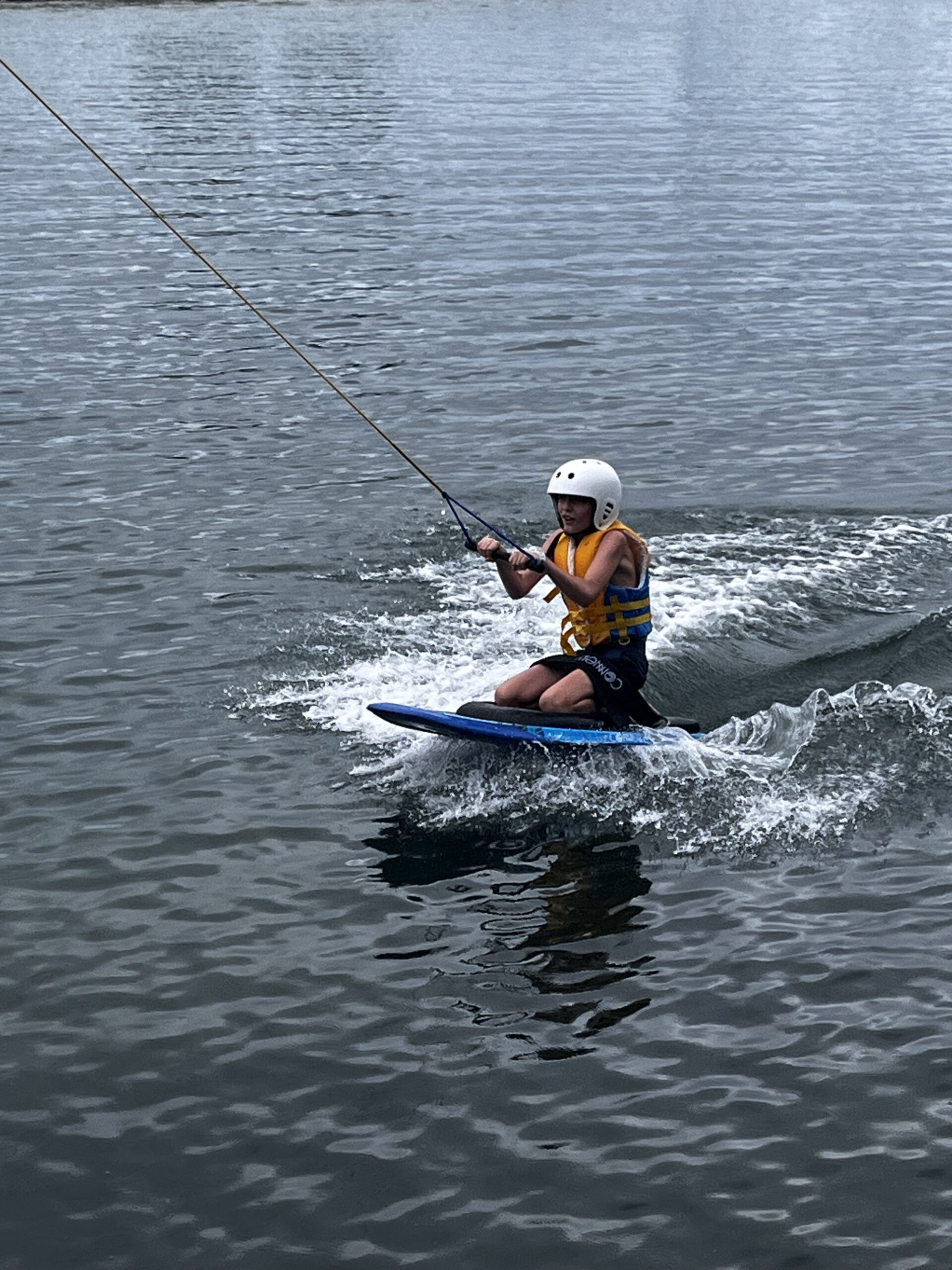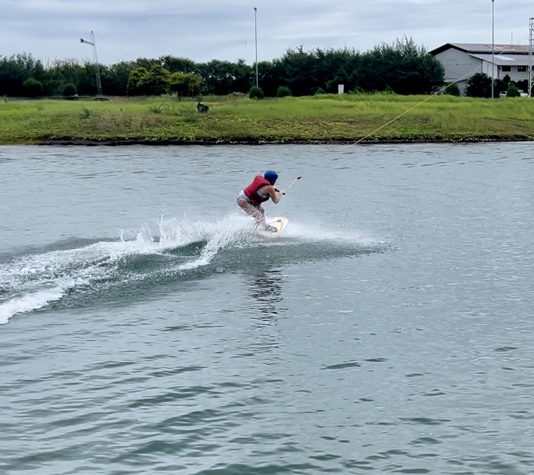 Lucas, Alexander og Tobias valgte at prøve kneeboardet, og jeg havde bestemt mig for at denne gang skulle det altså være det rigtige wakeboard. Drengene var super gode til det, og de drønede bare rundt på banen. Jeg skulle lige lære teknikken, det er som om kroppen gør noget andet end det man egentlig vil have den til. Efter et par forsøg fik jeg knækket koden, man skulle faktisk stå lidt på samme måde som da jeg surfede.