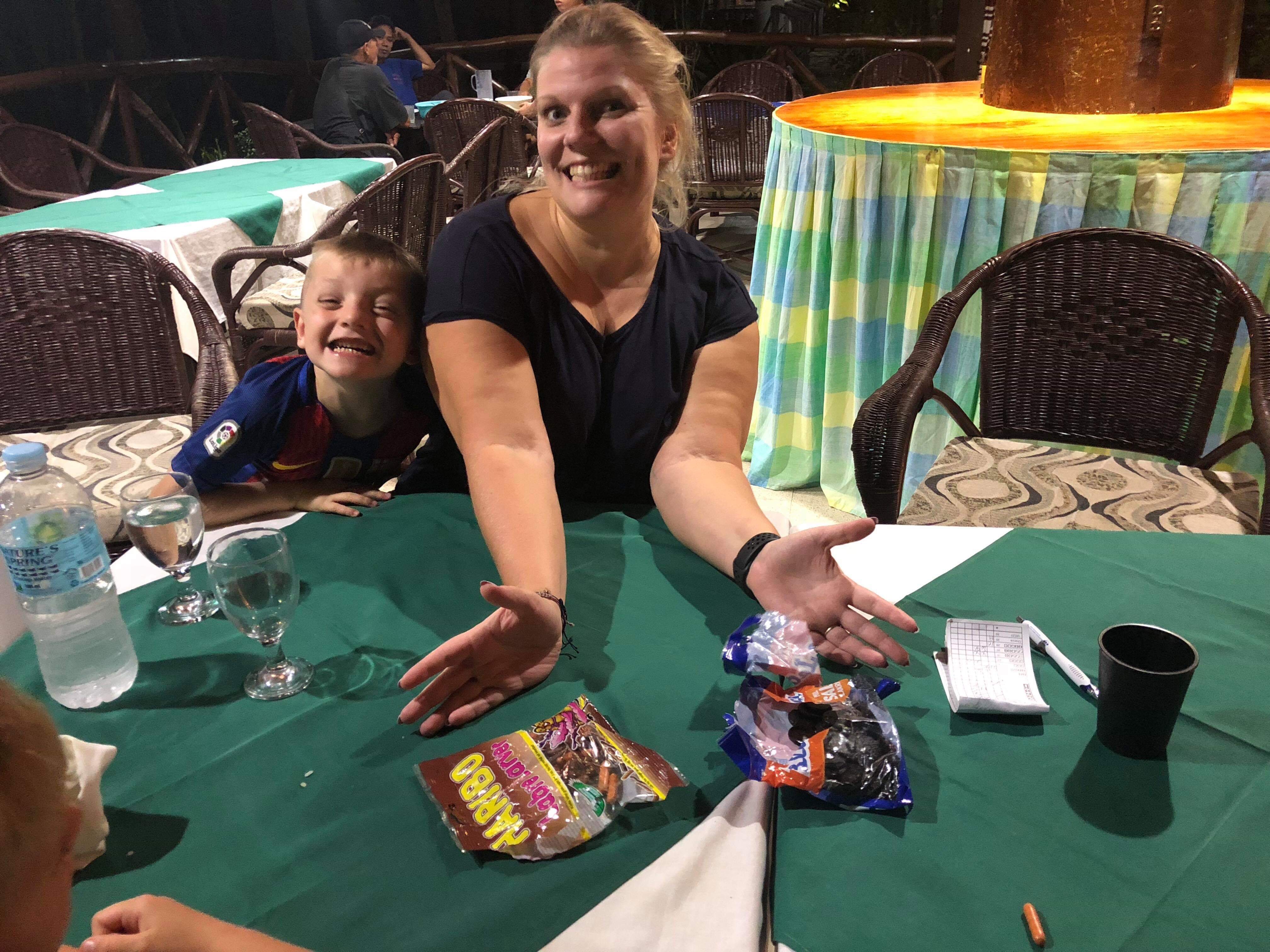 Imens vi sad på restauranten havde vi også et par oplevelser med Filippinernes dyreliv. Imens jeg sad og ventede på maden kom der et dyr flyvende og landede på bordet mellem Signe og jeg. Vi kaldte på tjeneren og fik hende til at fjerne den. Hun fik i stedet skubbet til den, så den fløj over mod mig. Jeg blev så forskrækket at jeg skreg mens jeg hysterisk rykkede stolen tilbage så jeg stødte ind i buffetbordet. Hun smilede lidt, men vi kunne tydeligt se at hun syntes jeg var noget af en dramaqueen 😱😱 Lidt efter kom en frø hoppende hen over gulvet, mens der sad gekkoer alle steder på væggene.