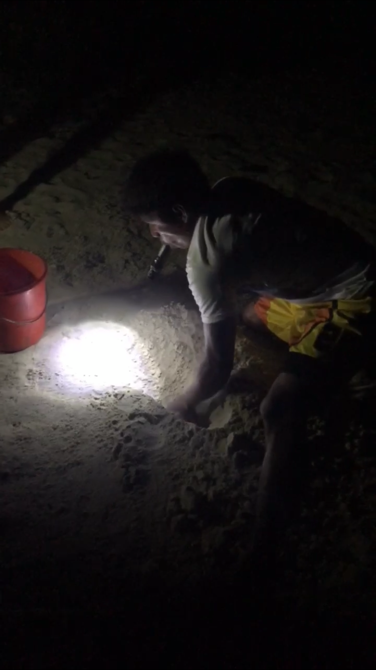 Efter vi havde spist aftensmad var drengene blevet lovet at komme på krabbejagt. Og de kunne næsten ikke vente, men gutterne der skulle med, skulle lige være færdige med at mose alt kokosen ud af nødderne, så det kunne blive brugt som kokosmælk i maden her.